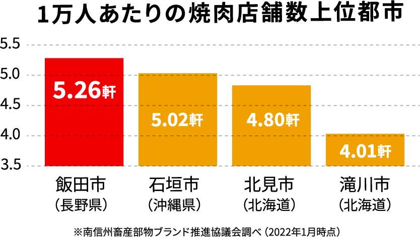 飯田市は人口1万人あたりの焼肉店舗数が5.26軒と、全国の市の中で最も焼肉店が多い街です。ちなみに全国平均は1.7軒。
