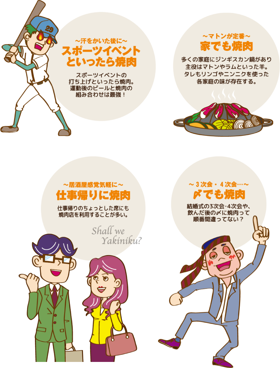 飯田市農業課の調べによると「仕事終わりに焼肉をする」と答えた人が飯田市では45%と、東海地方の2.5倍以上。その反面、誕生日などの祝いの席で焼肉を食べると回答したのは東海地方の1/3ほどでした。この地域では焼肉は特別な食べものというより、日常的な料理のひとつです。なにかあると焼肉があたりまえの人々にとって焼肉はいわばソウルフード、とっても身近な存在なのです。