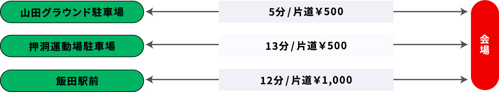 飯田駅前、山田グラウンド駐車場、押洞運動場駐車場より有料シャトルバスが随時運行します。