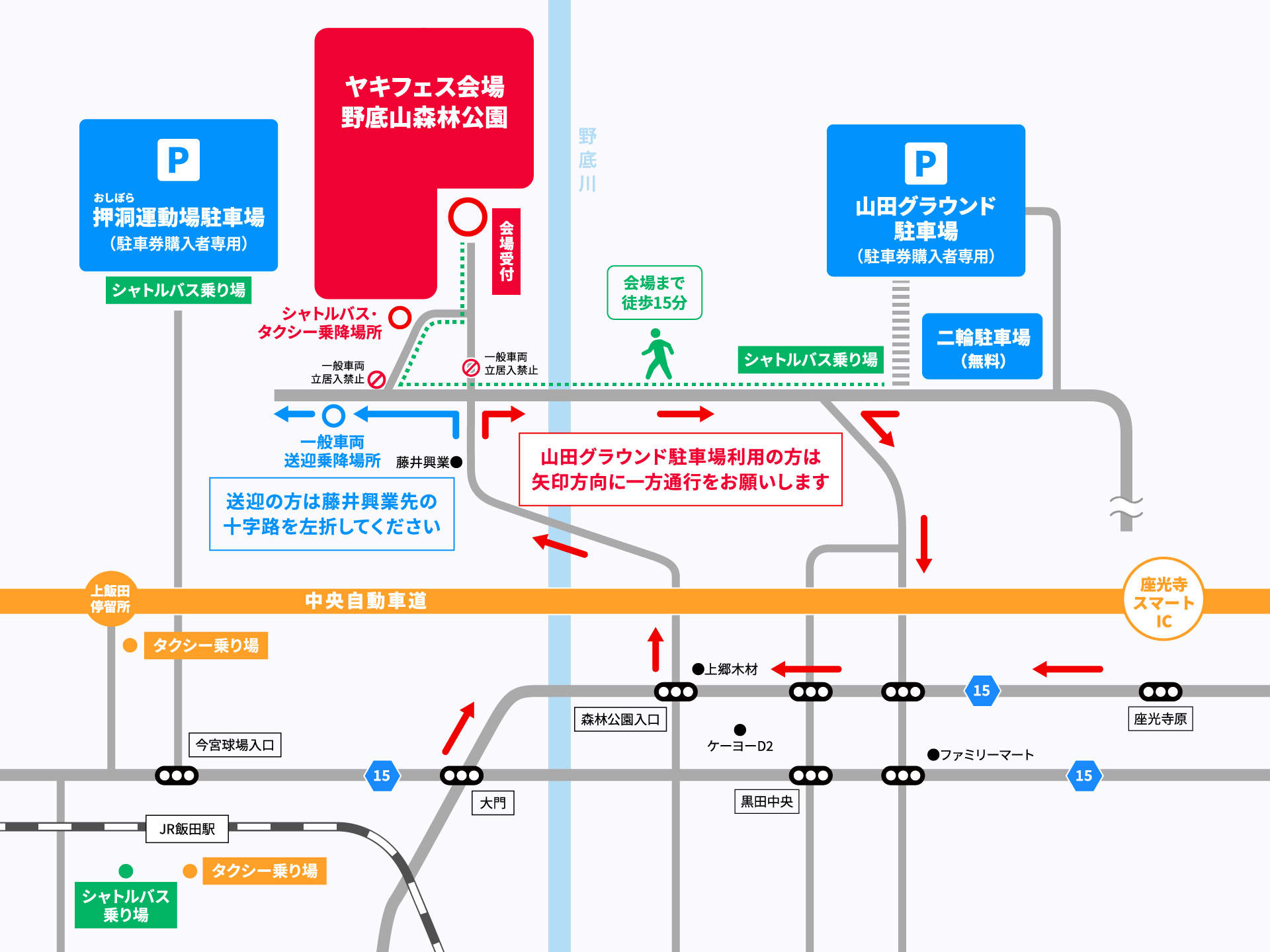 各駐車場からはシャトルバス又はタクシーをご利用ください。