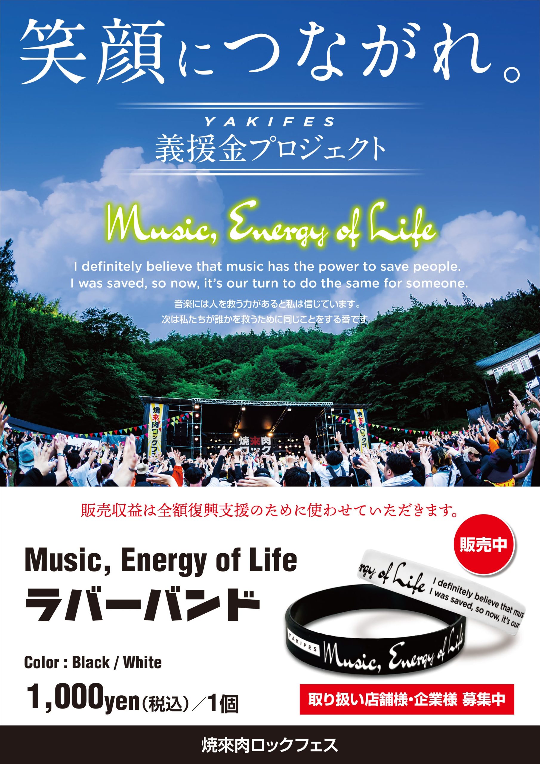 今年も、ヤキフェス2025に取り組める事、そしてヤキフェスが続けられる事への感謝も込めて、ヤキフェスの縁で生れた音楽の力で何かの、誰かの役に立ちたく、、、、義援金プロジェクトとしてラバーバンドの販売で支援に繋げて行きたいと思います。是非、皆さんのご理解やご協力も頂き、ラバーバンドの購入へお力添えをどうぞよろしくお願い致します。
