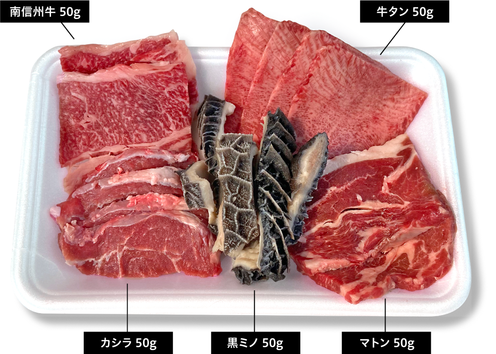 カシラ50g、マトン50g、黒ミノ50g、南信州牛50g、牛タン50g、野菜