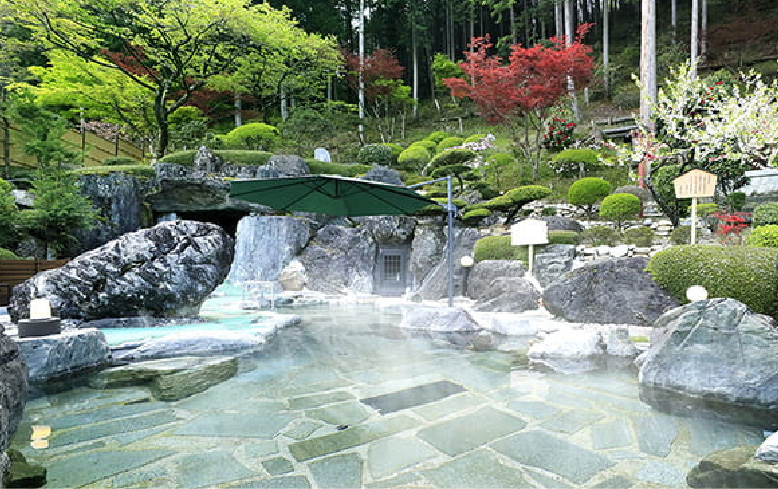 若返りの湯として評判のホテル阿智川では、露天風呂、洞窟風呂、内風呂、サウナが楽しめます。